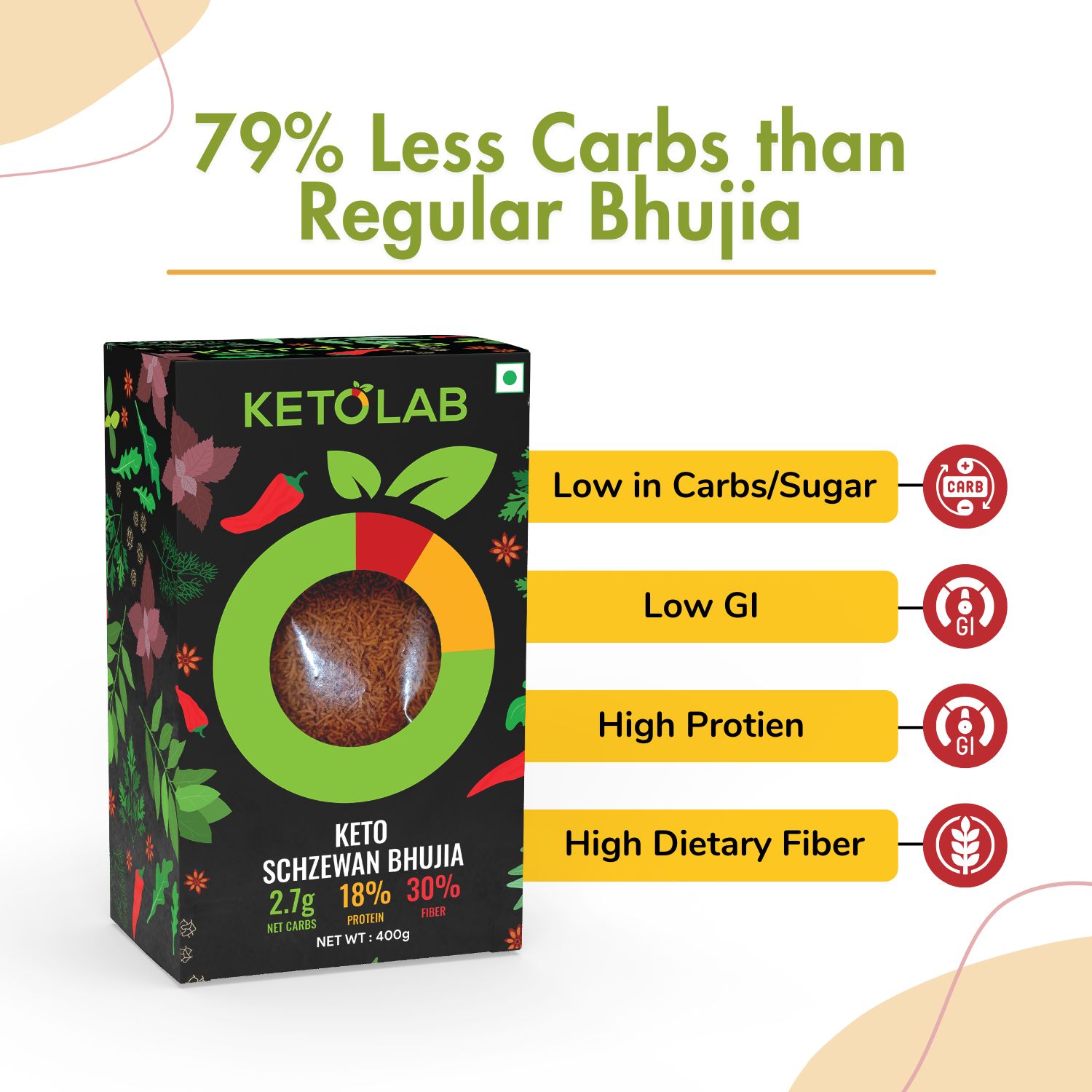 • PERFECT FOR DIABETICS & KETO : Ketolab Keto Bhujia (Sezwan) has just 2.7g Carbs and does not affect blood sugar and insulin levels. This makes it an ideal Bhujia (Sezwan) replacement for diabetics and those following KETO, LOW-CARB & LOW-CALORIE DIETS.