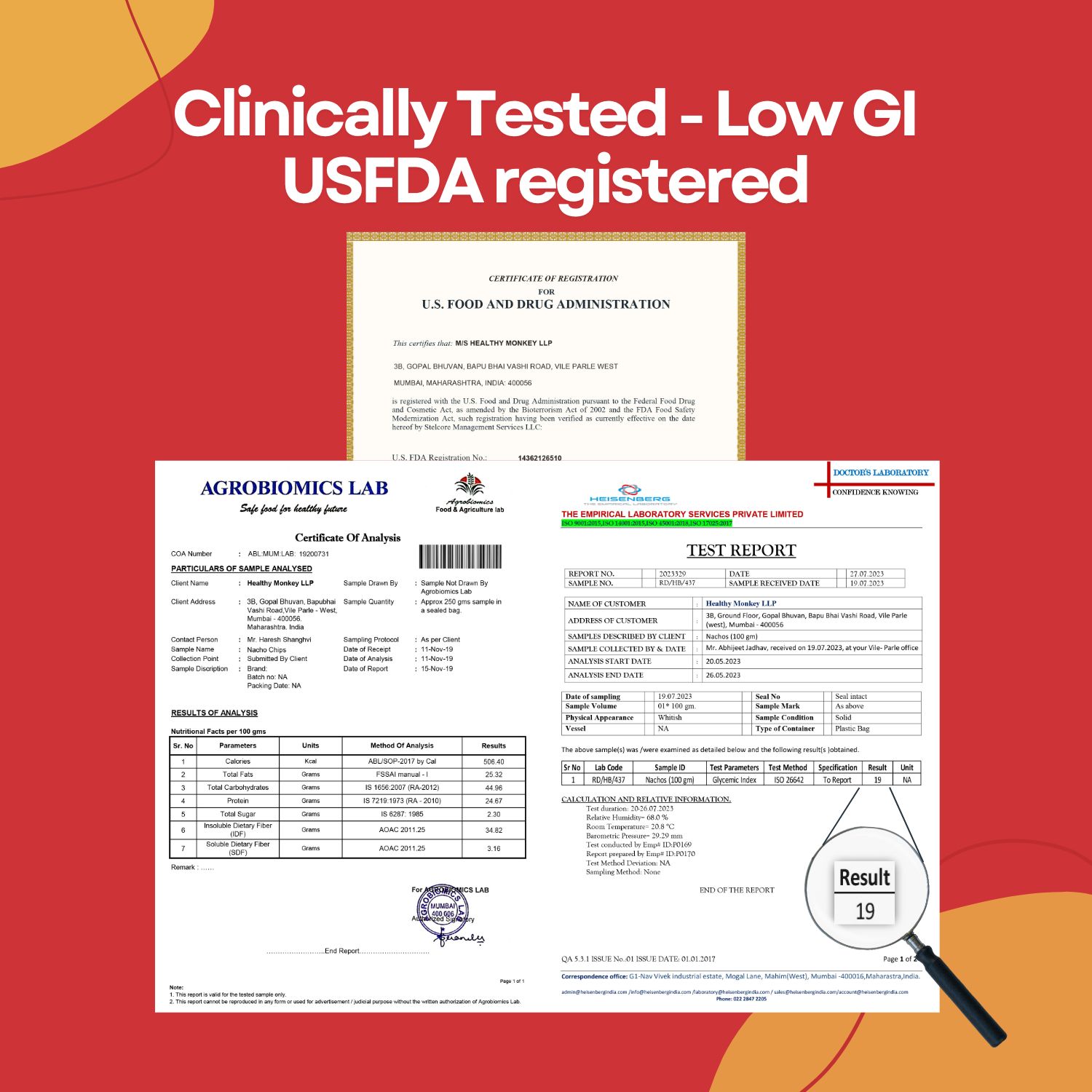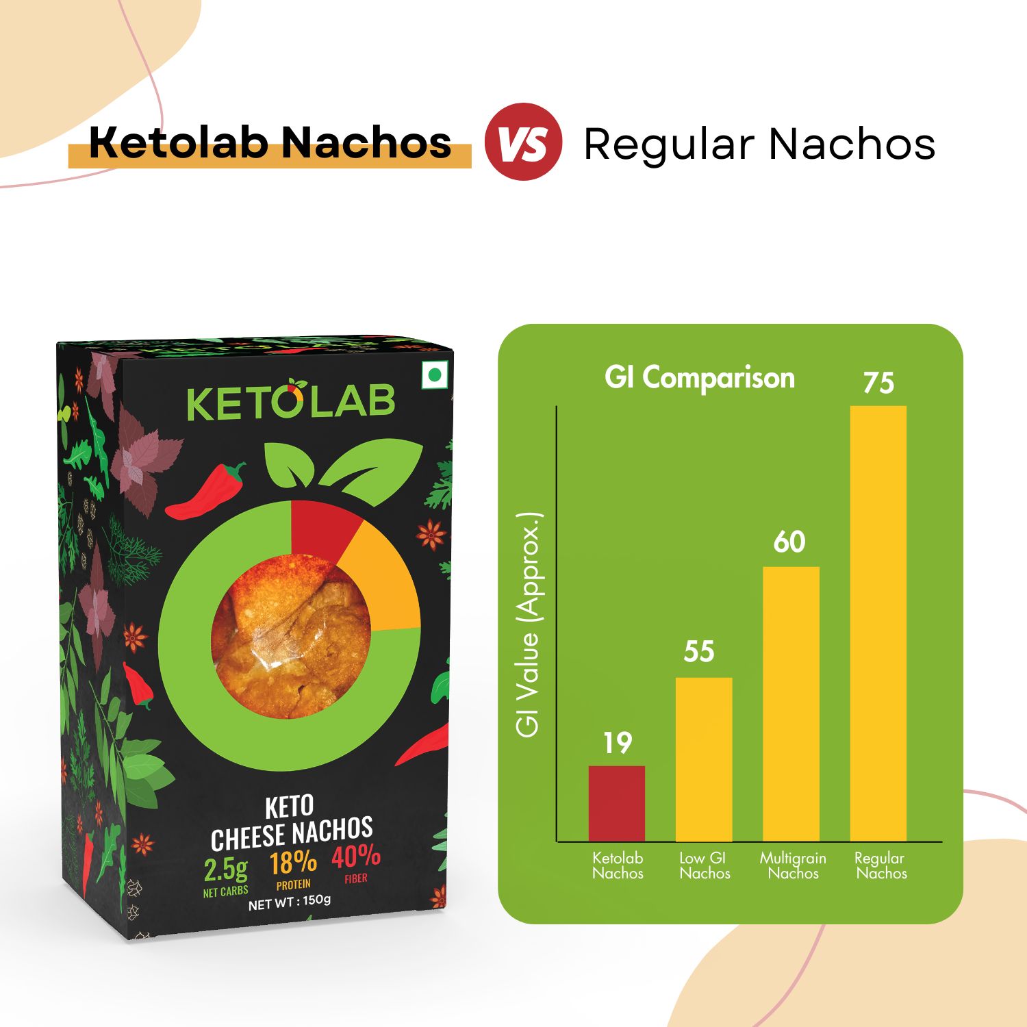 • CLINICALLY TESTED LOW GLYCEMIC INDEX (GI) OF JUST 19 : Ketolab Keto Cheese Nacho Chips is unlike Regular Nacho Chips that spikes blood sugar, Ketolab Keto Cheese Nacho Chips is lab-tested with a remarkably low GI of 19 – that is less than Eggplant . This means sustained energy on a diabetic or low-carb lifestyle, all while enjoying delicious food!