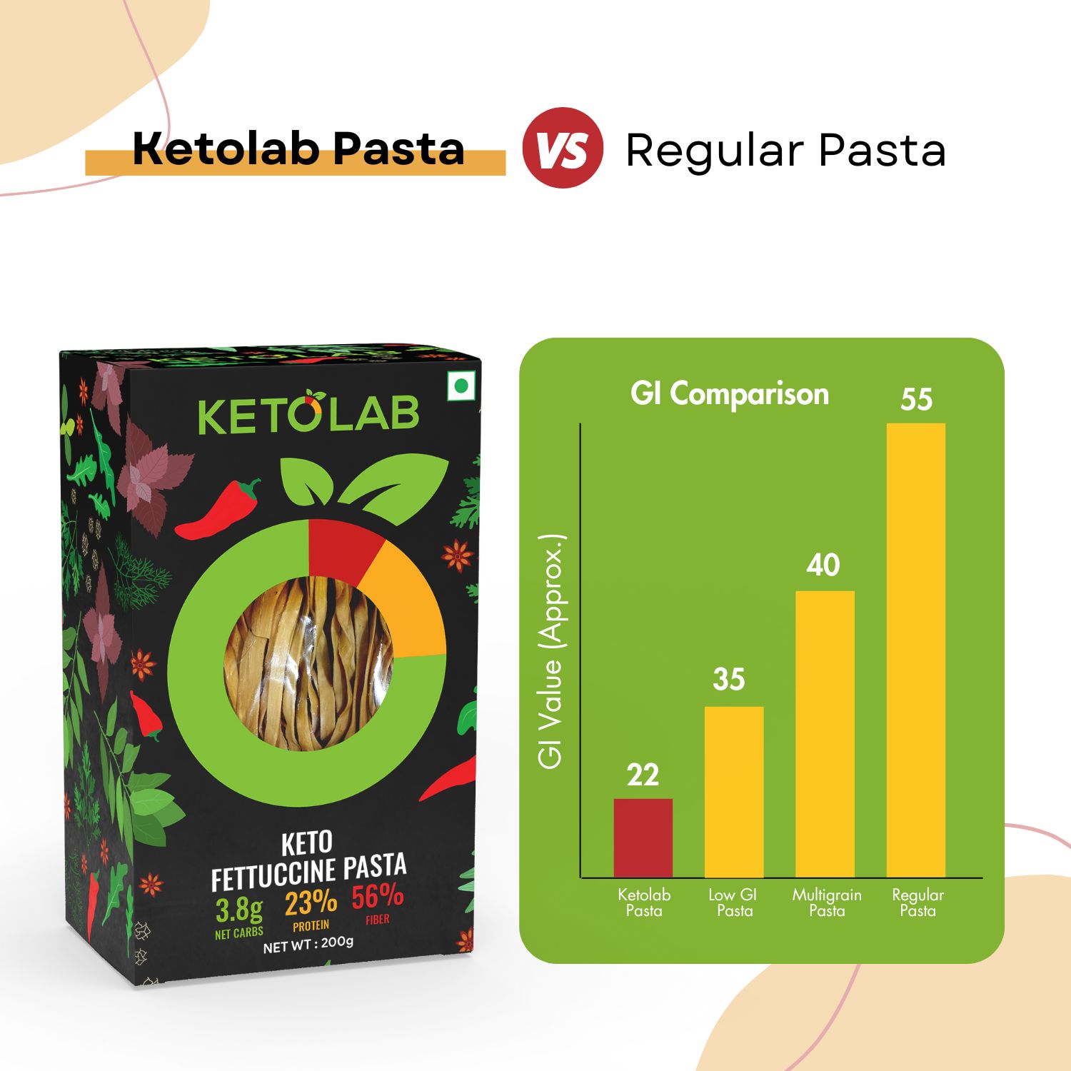 • CLINICALLY TESTED LOW GLYCEMIC INDEX (GI) OF JUST 22 : Ketolab Keto Fettuccine Pasta (Flat noodles) is unlike Regular Pasta that spikes blood sugar, Ketolab Keto Fettuccine Pasta (Flat noodles) is lab-tested with a remarkably low GI of 22 – that is less than Green Peas . This means sustained energy on a diabetic or low-carb lifestyle, all while enjoying delicious food!