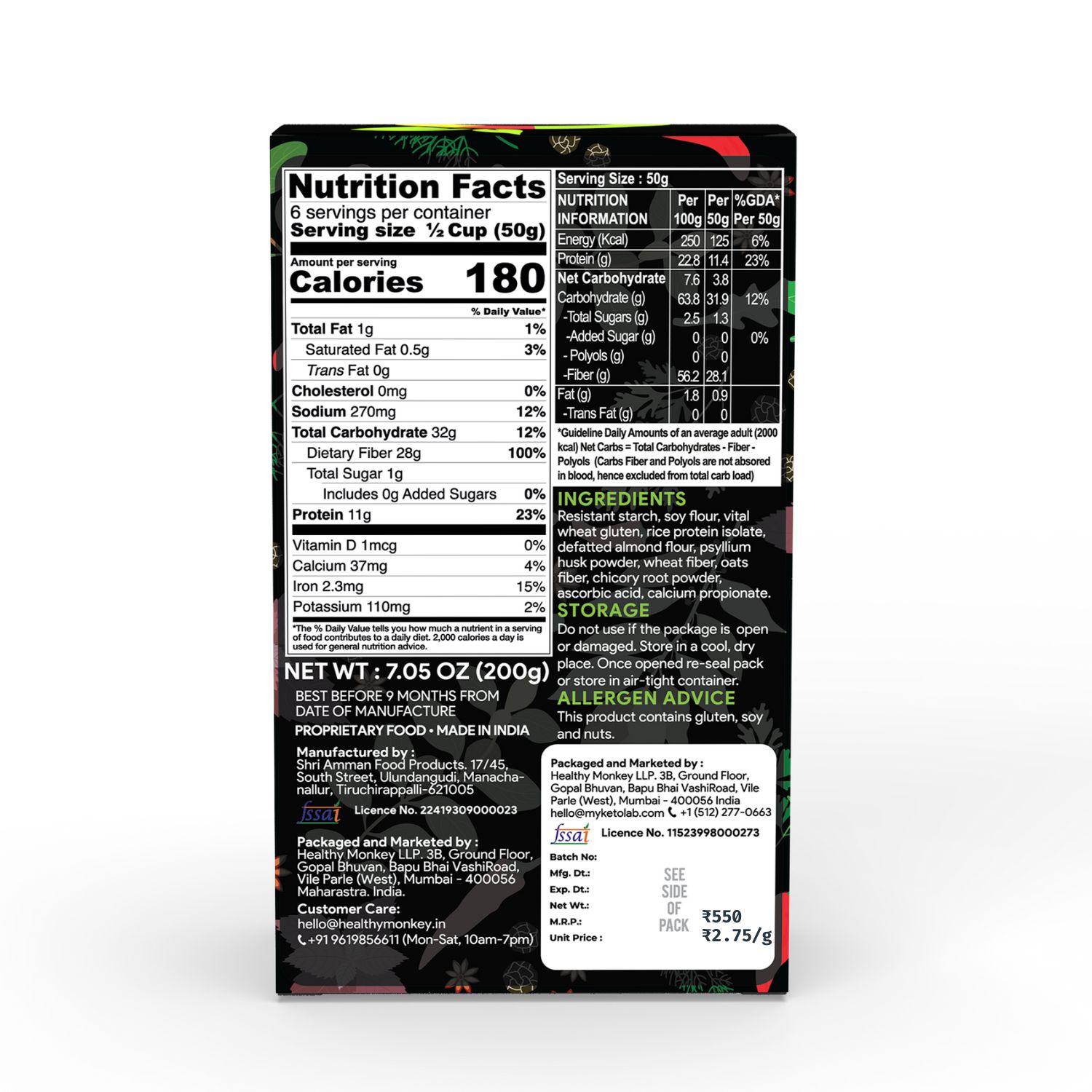 Marketed By: Healthy Monkey LLP. 3B, Gopal Bhuvan, Bapu Bhai Vashi Road, Vile Parle (west), Mumbai – 400056, Maharastra. India. FSSAI : 11522006000113
