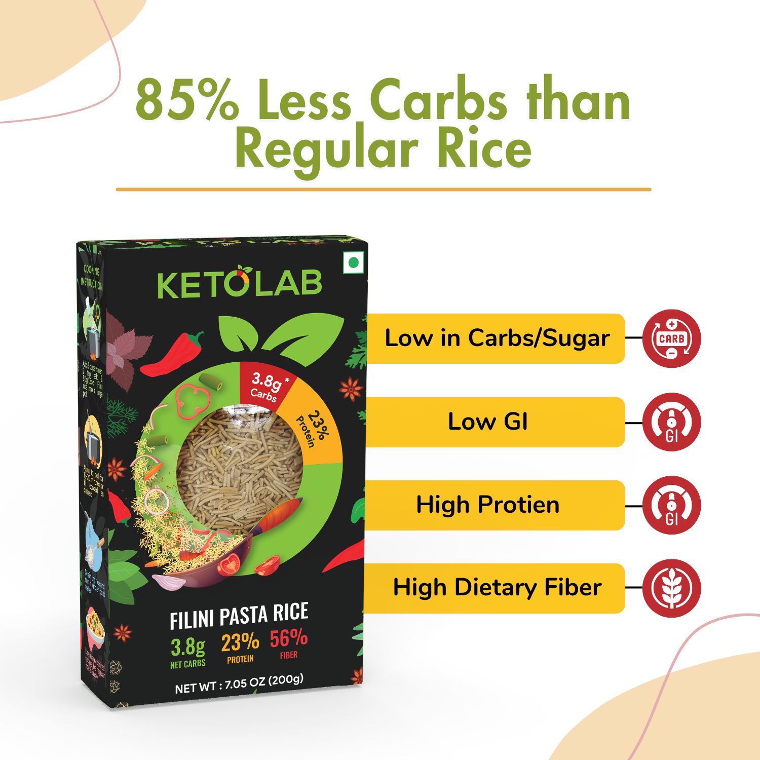 • CLINICALLY TESTED LOW GLYCEMIC INDEX (GI) OF JUST 22 : Ketolab Keto Filini Orzo Rice is unlike Regular Rice that spikes blood sugar, Ketolab Keto Filini Orzo Rice is lab-tested with a remarkably low GI of 22 – that is less than Green Peas . This means sustained energy on a diabetic or low-carb lifestyle, all while enjoying delicious food!