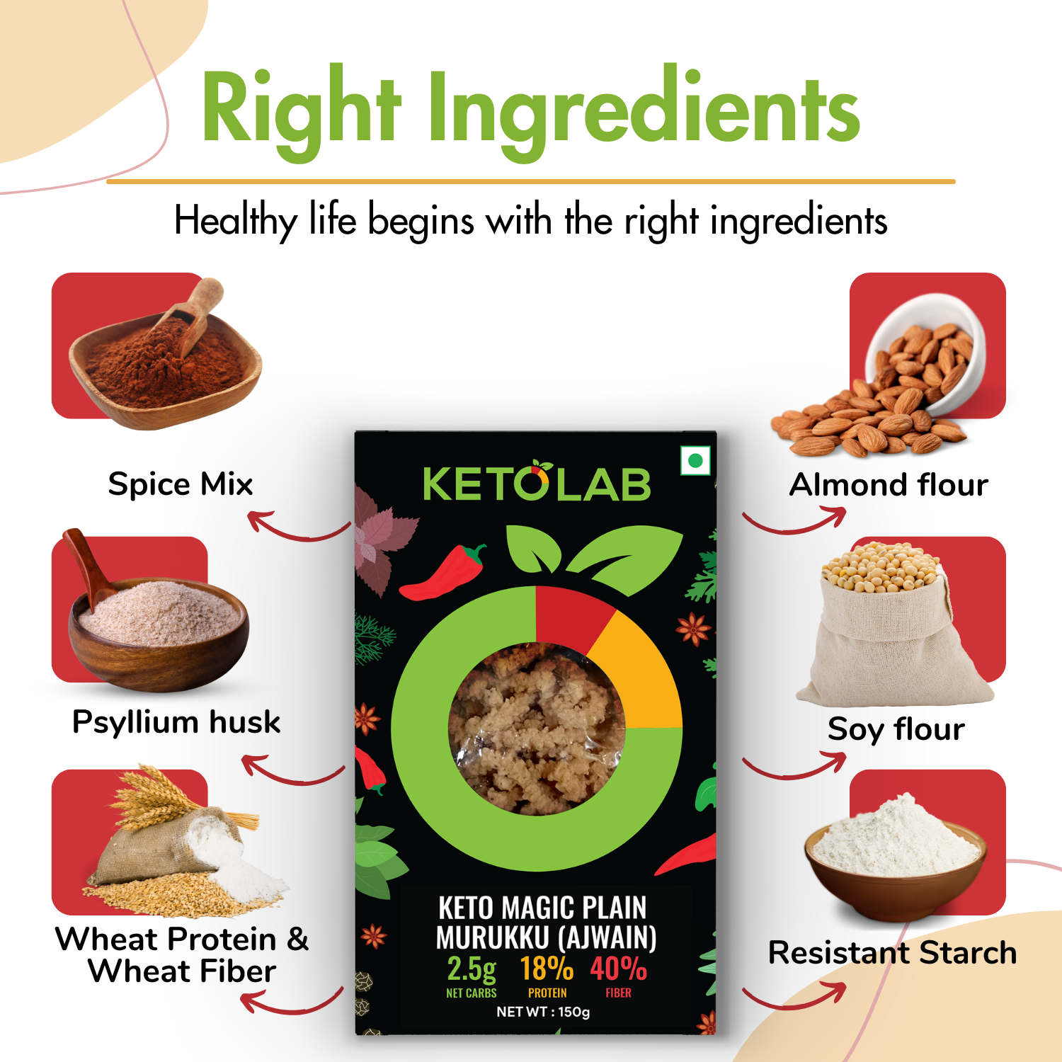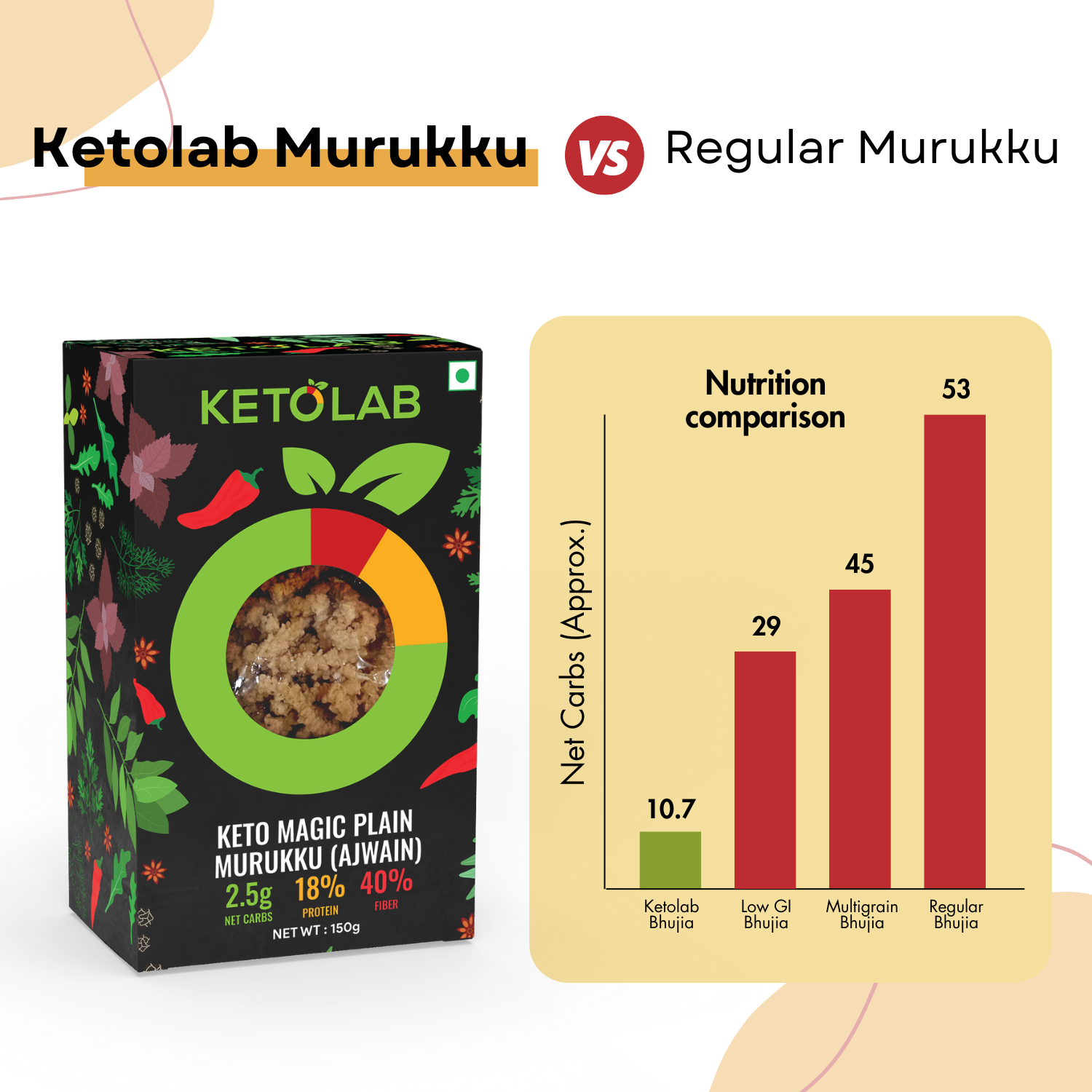 TASTE IDENTICAL : Ketolab Keto Murukku (Ajwain) is taste Identical to Regular Murukku. We work hard to ensure that you can enjoy yourself even on a low-carb lifestyle without compromising on taste.