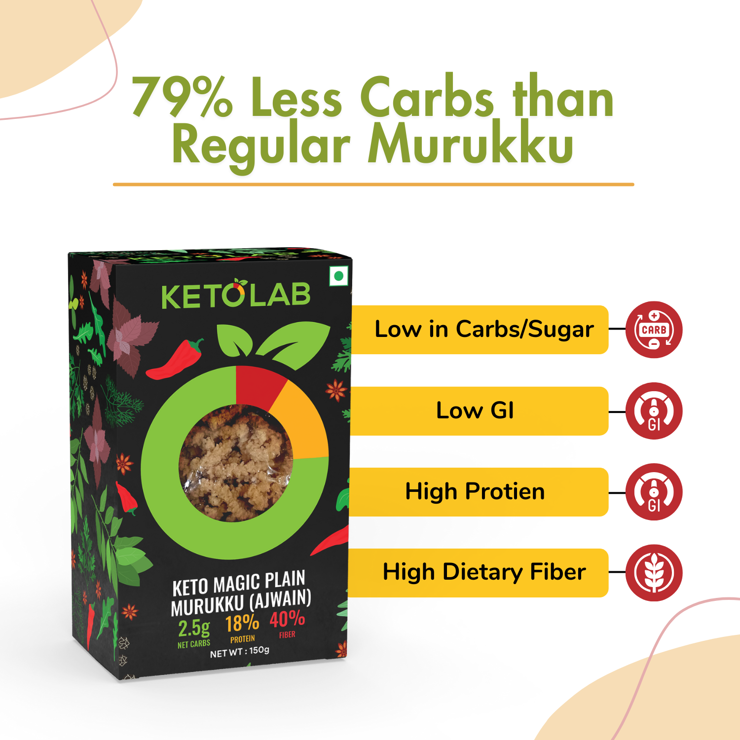 PERFECT FOR DIABETICS & KETO : Ketolab Keto Murukku (Ajwain) has just 2.5g Carbs and does not affect blood sugar and insulin levels. This makes it an ideal Murukku (Ajwain) replacement for diabetics and those following KETO, LOW-CARB & LOW-CALORIE DIETS.