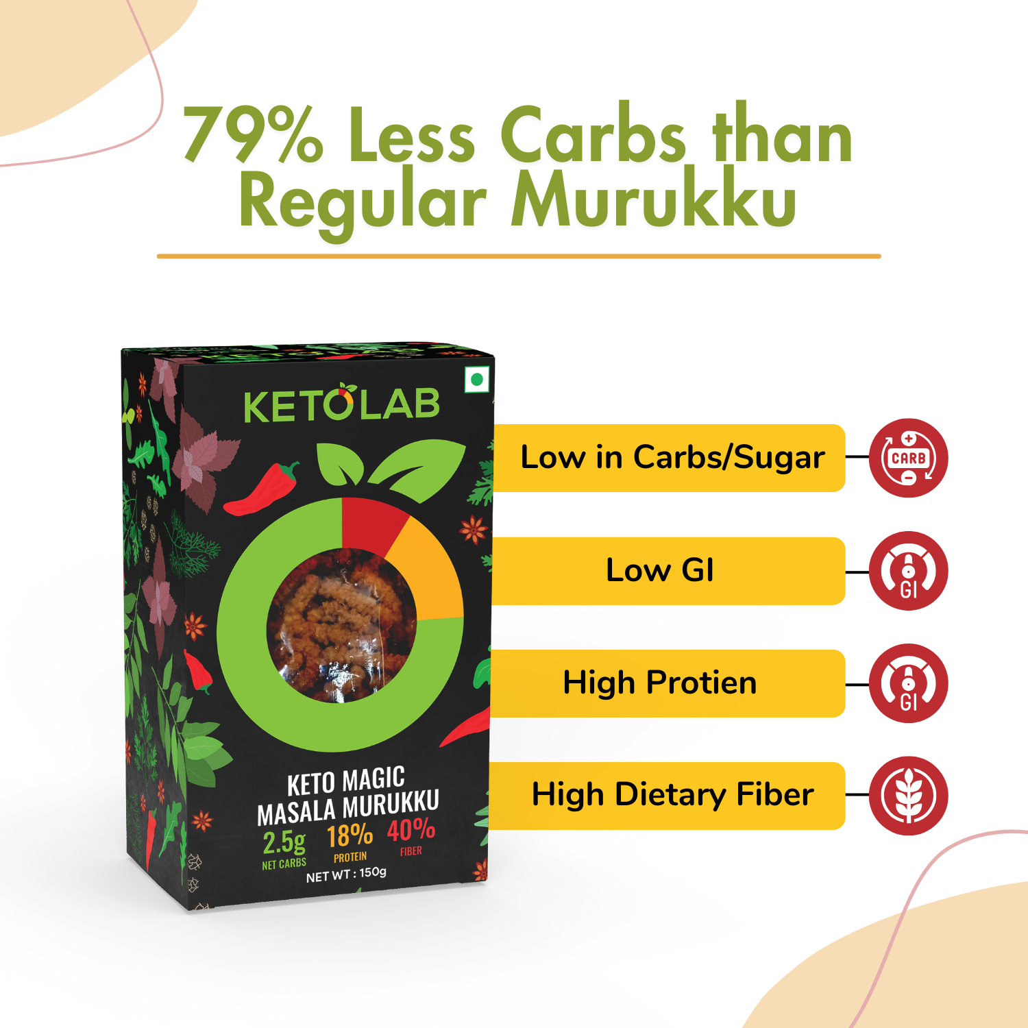 PERFECT FOR DIABETICS & KETO : Ketolab Keto Murukku (Magic Masala) has just 2.5g Carbs and does not affect blood sugar and insulin levels. This makes it an ideal Murukku (Magic Masala) replacement for diabetics and those following KETO, LOW-CARB & LOW-CALORIE DIETS.