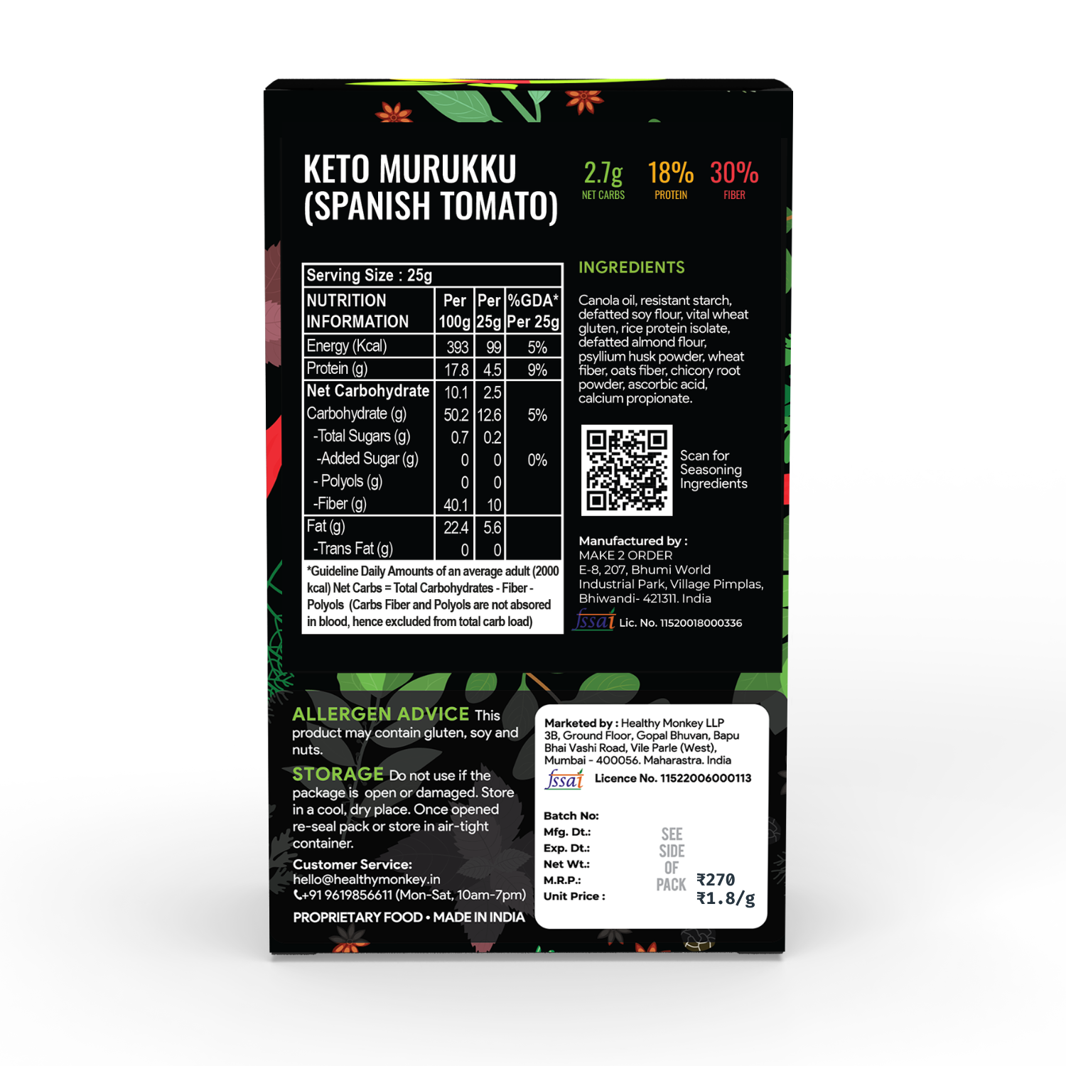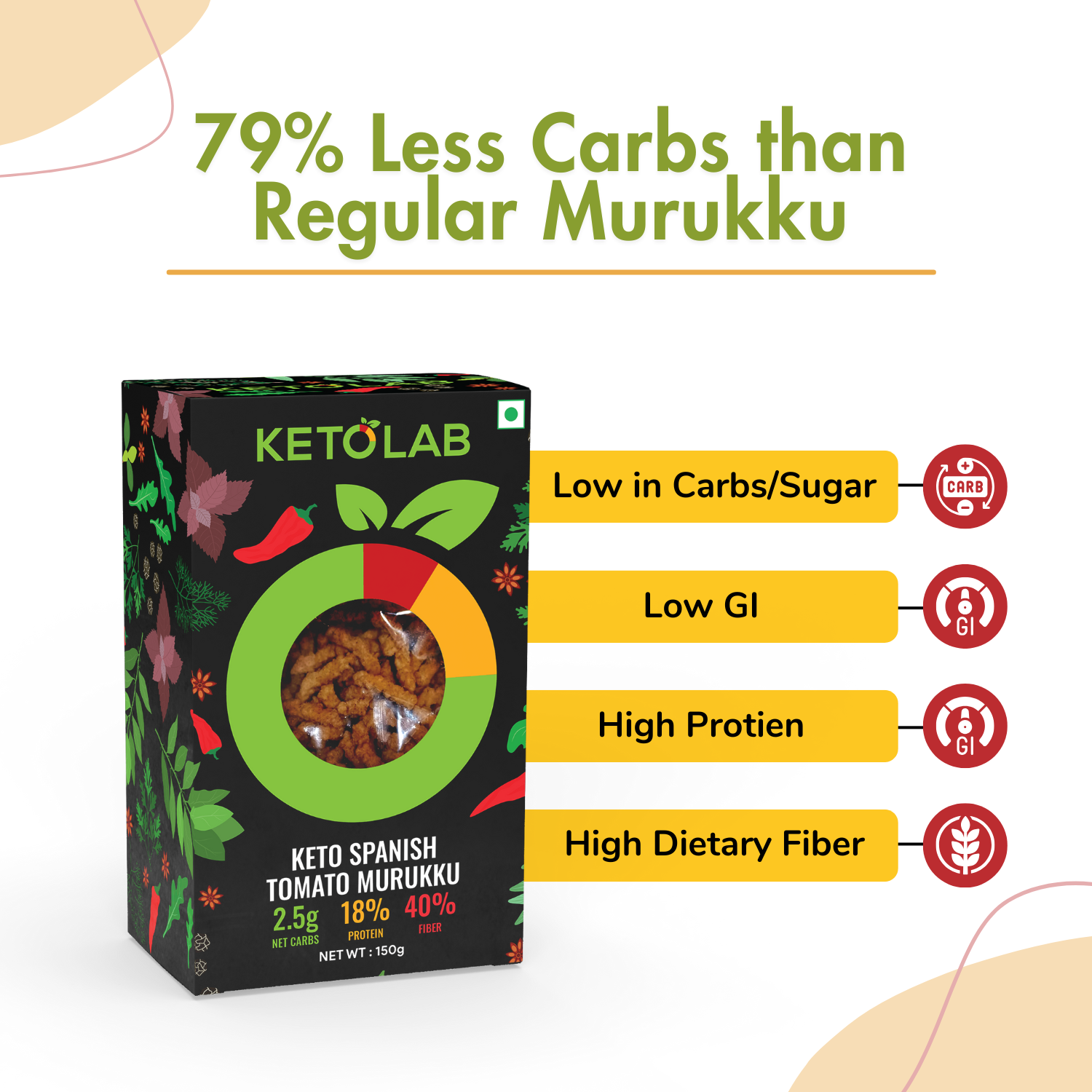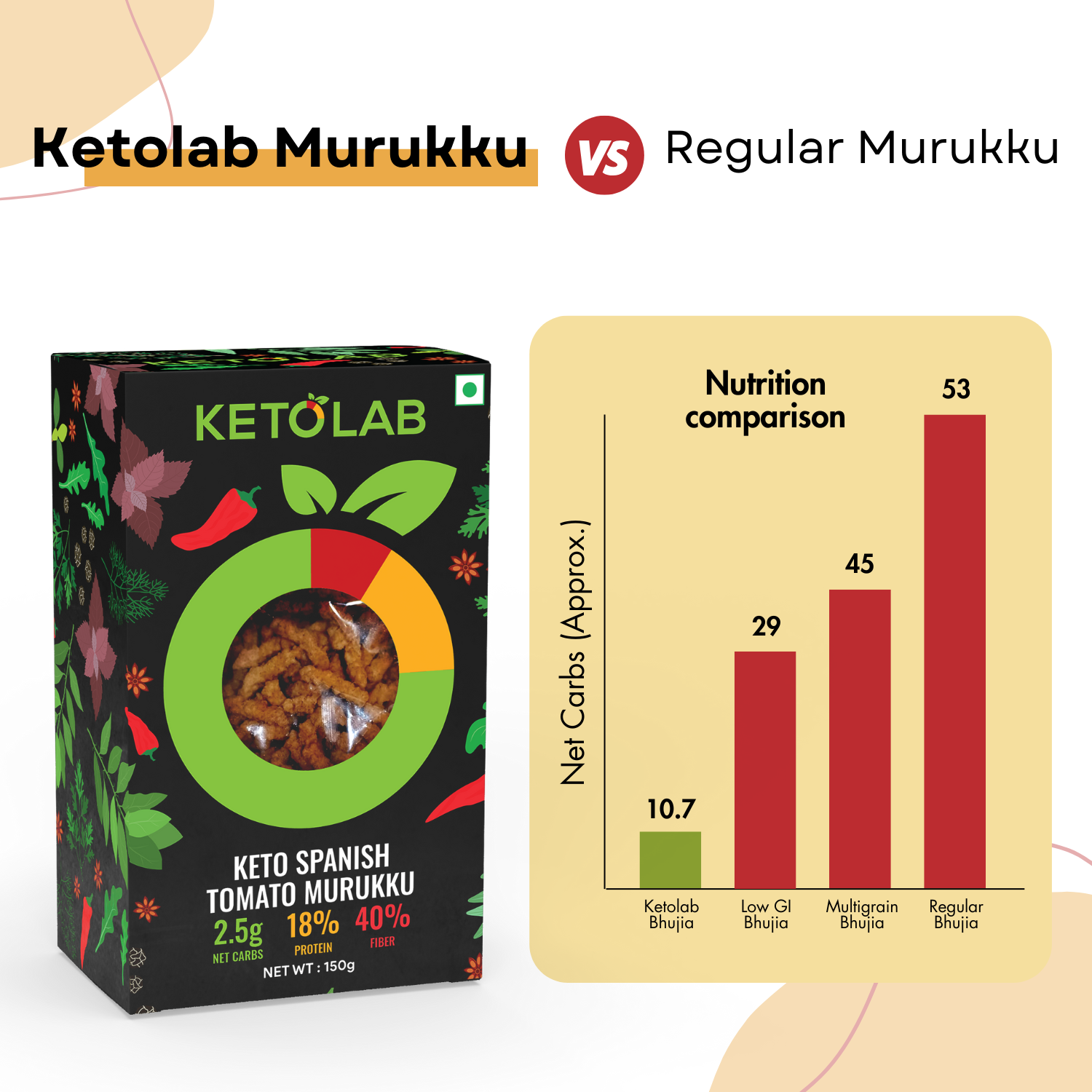 PERFECT FOR DIABETICS & KETO : Ketolab Keto Murukku (Spanish Tomato) has just 2.5g Carbs and does not affect blood sugar and insulin levels. This makes it an ideal Murukku (Spanish Tomato) replacement for diabetics and those following KETO, LOW-CARB & LOW-CALORIE DIETS.